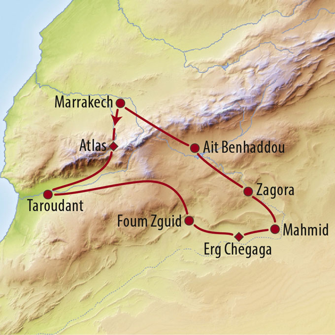 Hoher Atlas: Kasbah Bab Ourika, Taroudant: Dar Al Hossoun, Erg Chegaga: Sahara Erg Chegaga Ghazala Camp, Zagora: Azalai Desert Lodge, Ait Benhaddou: Riad Caravane (Suite).