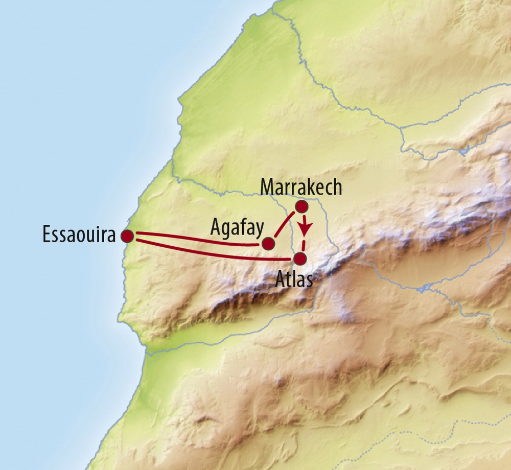 Heute fahren Sie zur Atlantikküste, ins charmante Städtchen Essaouria. Die blau-weiss getünchte Hafenstadt besticht mit ihrer beschaulichen Medina, den vielen Cafés, unzähligen kleinen Ateliers, dem lebhaften Hafen und dem Surfer-Strand. Übernachtungen in Essaouira.